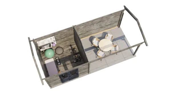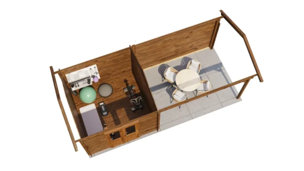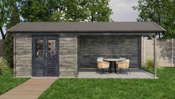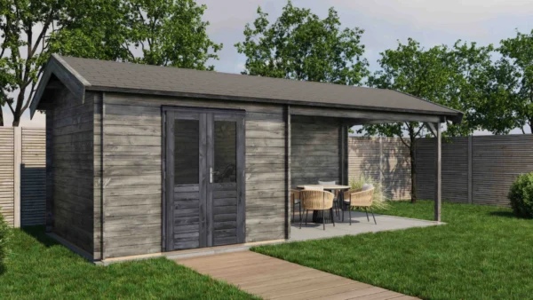 1st Class Kiln-Dried Spruce - 18mm T&G Roofboards - Double Glazing - Double door with laminated 4,5cm thick wood - all iron- and hardware included With an overall footprint of 309, it’s ideal for gardens where you want maximum usability without wasting space. The integrated veranda (veranda left side) adds a sheltered area for seating, storage, or keeping the entrance protected.
