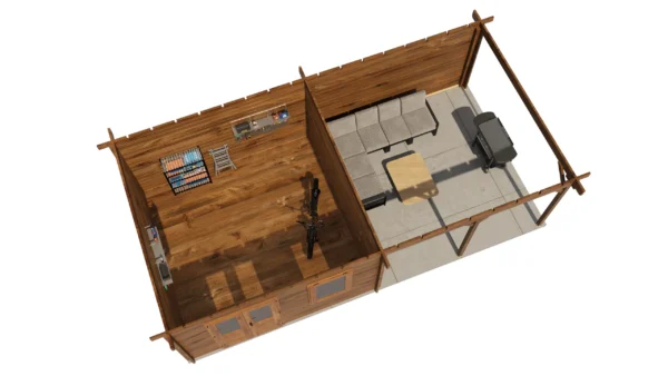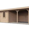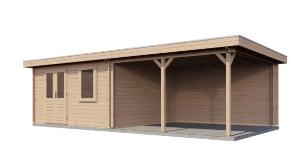 1st Class Kiln-Dried Spruce - 18mm T&G Roofboards - Double Glazing - Double door and top hung window with laminated 4,5cm thick wood - all iron- and hardware included With an overall footprint of 412, it’s ideal for gardens where you want maximum usability without wasting space. The integrated veranda (veranda left side) adds a sheltered area for seating, storage, or keeping the entrance protected.