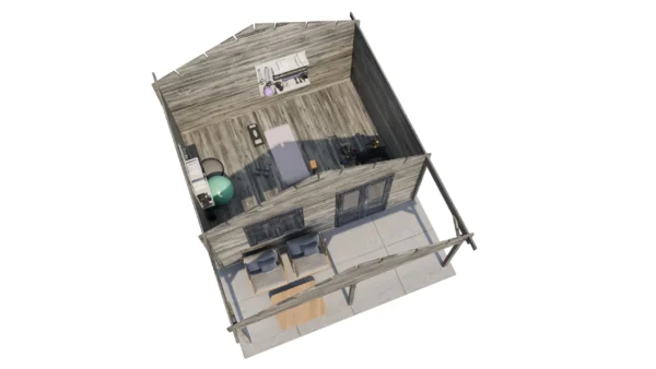 1st Class Kiln-Dried Spruce - 18mm T&G Roofboards - Double Glazing - Double door and top hung window with laminated 4,5cm thick wood - all iron- and hardware included With an overall footprint of 412, it’s ideal for gardens where you want maximum usability without wasting space. The integrated veranda (veranda left side) adds a sheltered area for seating, storage, or keeping the entrance protected.