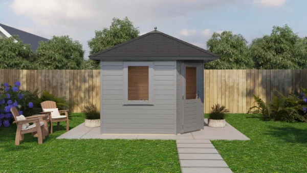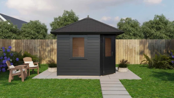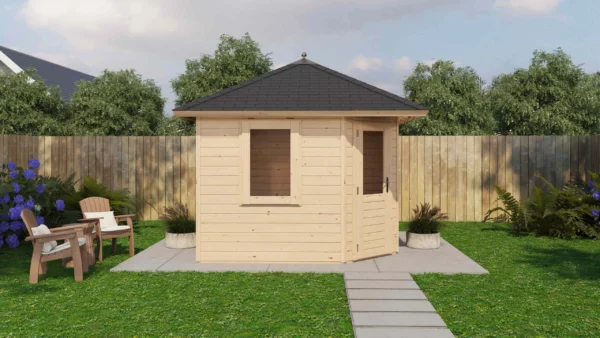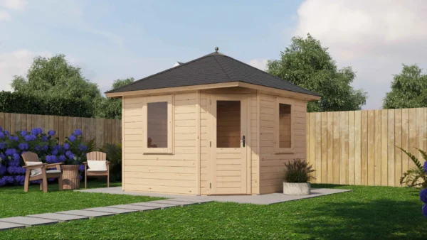 Lugarde Select Prima summerhouse Dumfries 300x300cm – Untreated (309) – Lugarde select Prima, 28 mm walls, five corner pyramidroof, untreated.