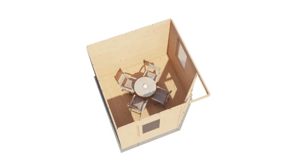 1st Class Kiln-Dried Spruce - 18mm T&G Roofboards - Double Glazing - Double door and top hung window with laminated 4,5cm thick wood - all iron- and hardware included With an overall footprint of 412, it’s ideal for gardens where you want maximum usability without wasting space. The integrated veranda (veranda left side) adds a sheltered area for seating, storage, or keeping the entrance protected.