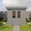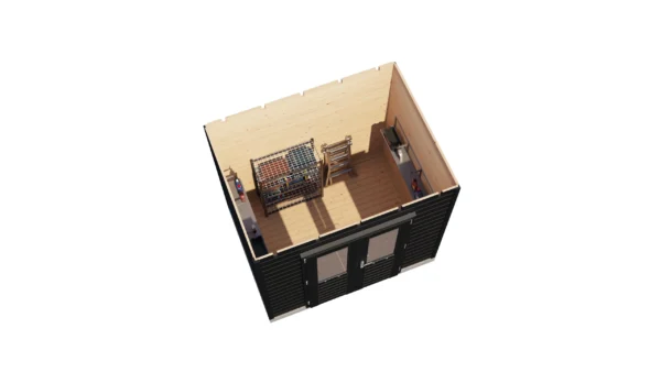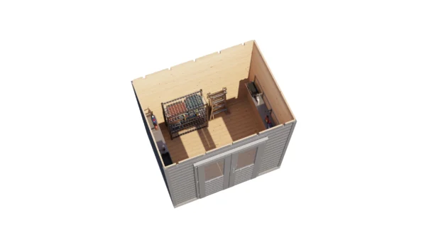 1st Class Kiln-Dried Spruce - 18mm T&G Roofboards - Double Glazing - Double door and top hung window with laminated 4,5cm thick wood - all iron- and hardware included With an overall footprint of 412, it’s ideal for gardens where you want maximum usability without wasting space. The integrated veranda (veranda left side) adds a sheltered area for seating, storage, or keeping the entrance protected.