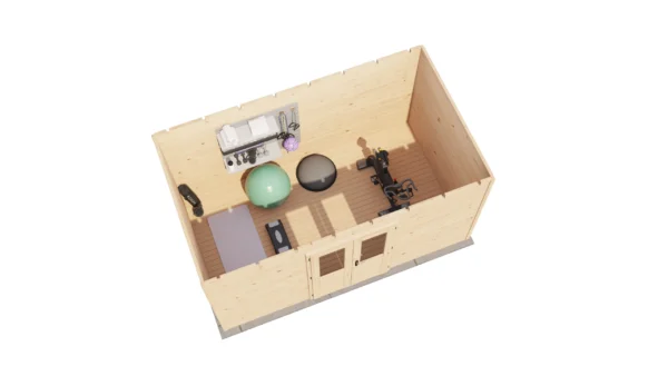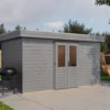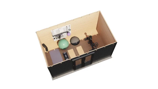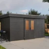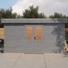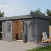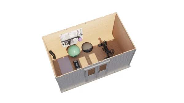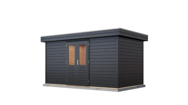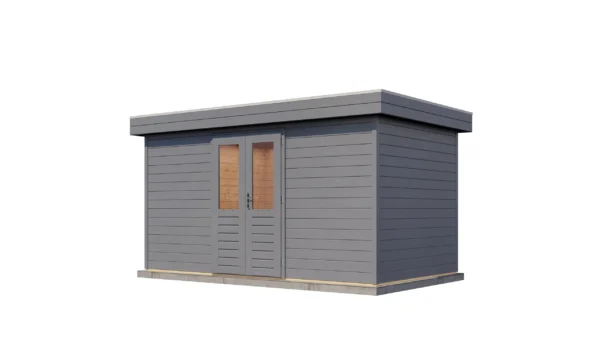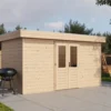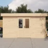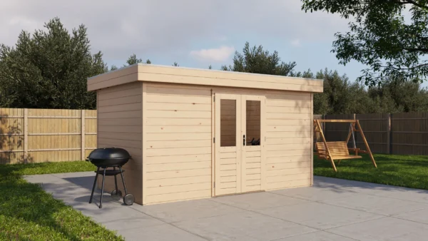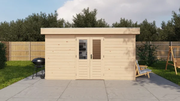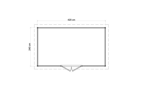 1st Class Kiln-Dried Spruce - 18mm T&G Roofboards - Double Glazing - Double door and top hung window with laminated 4,5cm thick wood - all iron- and hardware included With an overall footprint of 412, it’s ideal for gardens where you want maximum usability without wasting space. The integrated veranda (veranda left side) adds a sheltered area for seating, storage, or keeping the entrance protected.